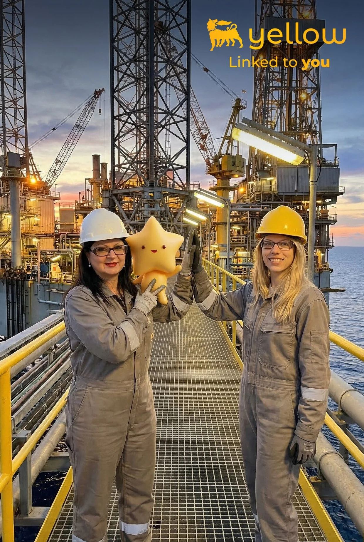 Un altro elemento distintivo dell’esperienza è stata l’interazione con la mascotte di Eni Yellow, inserita negli output finali come parte integrante della scena. Questo ha aggiunto una componente narrativa e identitaria molto forte, rafforzando il legame tra il progetto fotografico e il mondo visual del brand.